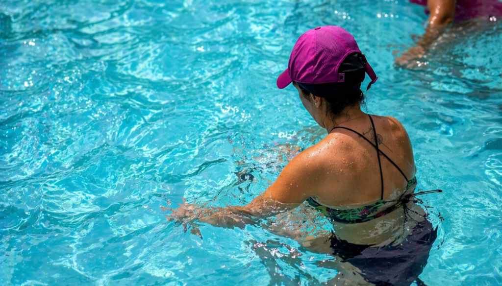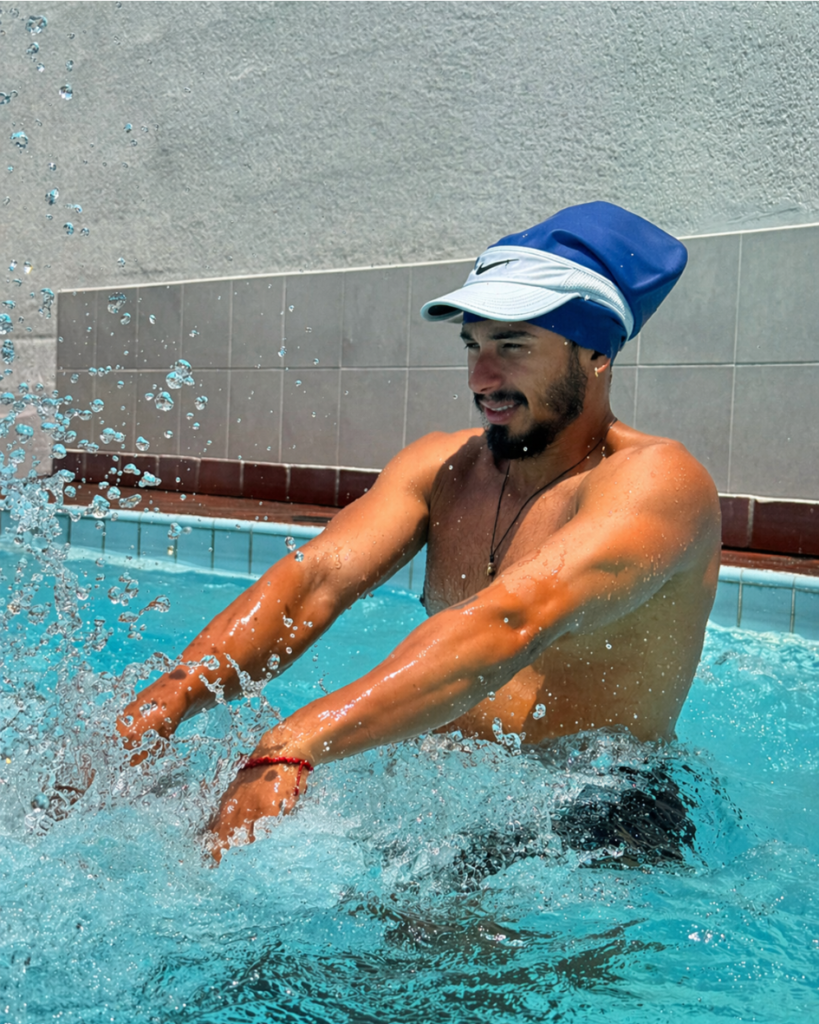 - IMPLEMENTOS ESENCIALES: toalla e hidratación, gorro de baño y capucha para protegerte del sol.